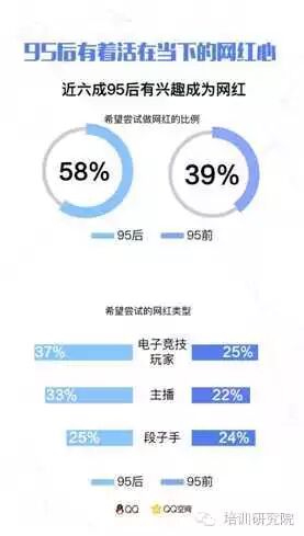 作为网络原住民,95后通过社交网络和QQ群找工作,并在QQ空间分享工作状态,都体现出对互联网使用的自如,以及乐观的心态。最让人关注的是,近六成95后有兴趣成为网红,甚至认为是日常,最想成为的网红类型是电子竞技玩家和主播。“看到别人玩就想试一下,”95后网红主播Coco笑称,“第一次直播是吃火锅,直播时偶像包袱超重的。”95后在用他们熟悉的互联网在找工作和新兴职业的尝试上如鱼得水。